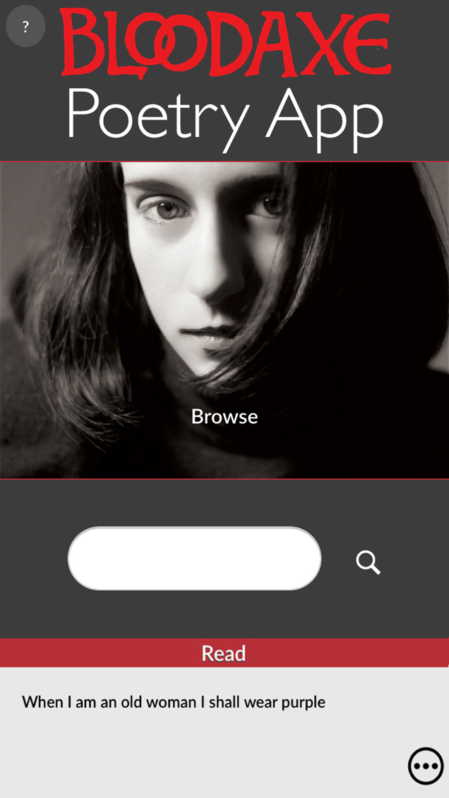 The app currently features work from over 70 Bloodaxe poets. In future versions, we hope to add more poets to the list, as well as improving the look and feel of the app, but we would also like to add and improve other features based on the thoughts of poetry readers. (Please send any feedback you may have to bloodaxe at this url: https://forms.ncl.ac.uk/view.php?id=5451563)